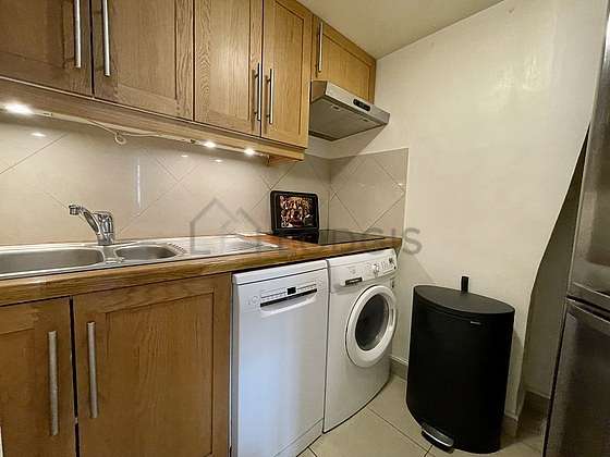 Este apartamento tem uma magnífico cozinha com azuleijo no piso e todo o equipamento pela sua vida quotidiana : fogaõ, frigorífico, exaustur, chaleira, máquina de café, loiça.
