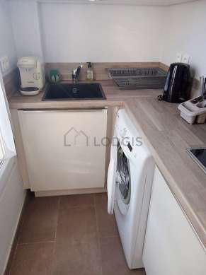 Este apartamento tem uma bonita cozinha com azuleijo no piso e todo o equipamento pela sua vida quotidiana : fogaõ, frigorífico, exaustur, chaleira, máquina de café, armário, loiça.