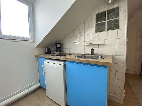 Este apartamento tem uma cozinha e todo o equipamento pela sua vida quotidiana : fogaõ, frigorífico, congelador, forno, micro-ondas combinado, chaleira, máquina de café, armário, loiça.
