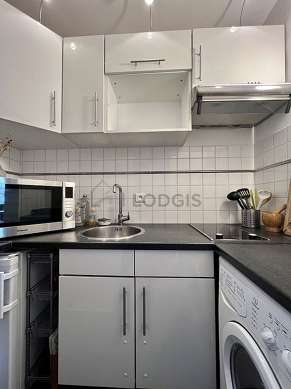 Este apartamento tem uma cozinha e todo o equipamento pela sua vida quotidiana : fogaõ, frigorífico, micro-ondas combinado, exaustur, torradeira.