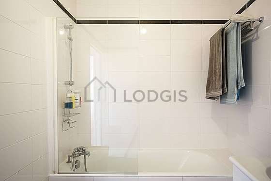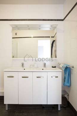 Este apartamento é equipado de uma casa de banho magnífico é muito clara. Esta sala de água dispõe do necessário pelo seu bem estar na sua vida quotidiana : toalhas de banho, armário, banheira, secador, airer, sink, towel rack, bin. Os WC são separados da casa de banho e situados em uma peça independente.