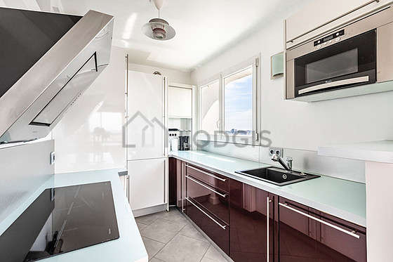 Este apartamento tem uma magnífico cozinha com azuleijo no piso e todo o equipamento pela sua vida quotidiana : fogaõ, frigorífico, congelador, forno, microondas, freezer, exaustur, torradeira, chaleira, máquina de café, prateleira, armário, loiça.