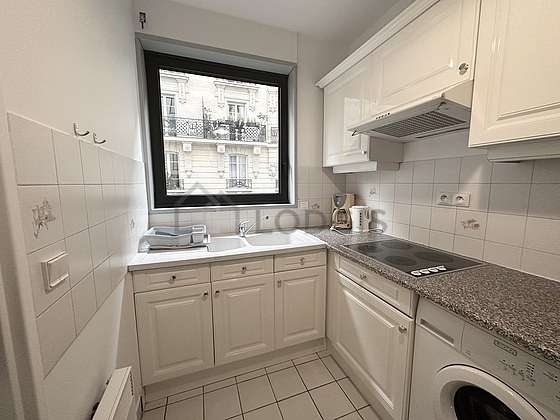 Este apartamento tem uma cozinha e todo o equipamento pela sua vida quotidiana : fogaõ, frigorífico, congelador, forno, microondas, exaustur, chaleira, máquina de café, armário, loiça.