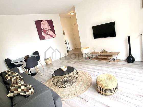 Este apartamento é composto de um magnífico salão com parqué no piso vista sobre rua. Este salão very quiet mobiliado et equipado para uma agradável estância : televisaõ, sofá, mesa de jantar, mesinha, prateleira, 1 cadeira(s), banco, entry way table, floor lamp, lamp, tv stand, mirror, coat stand, pouffe, curtains, painting, carpet, vase1 cama.