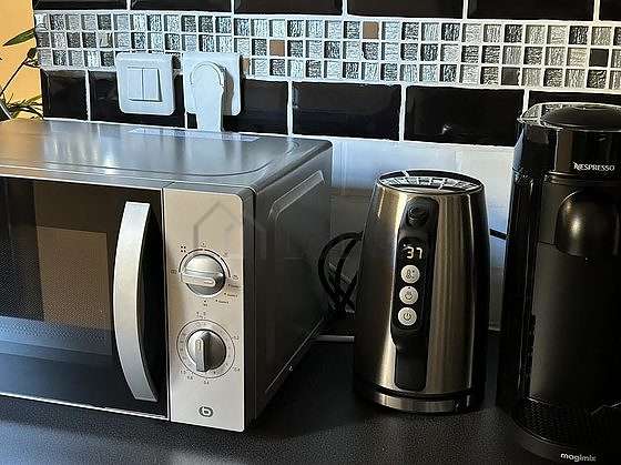 Este apartamento tem uma cozinha e todo o equipamento pela sua vida quotidiana : fogaõ, frigorífico, congelador, forno, microondas, torradeira, máquina de café, prateleira, armário, loiça, mixer, bin.