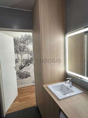 Este apartamento é equipado de uma casa de banho magnífico é muito clara. Esta sala de água dispõe do necessário pelo seu bem estar na sua vida quotidiana : toalhas de banho, roupeiro, prateleira, armário, ducheiro separado, secador, sink, radiator secador de toalhas. Os WC são integrados na casa de banho.