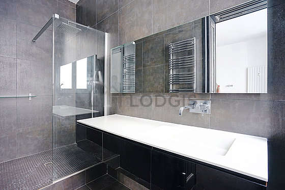 Este apartamento é equipado de uma casa de banho. Esta sala de água dispõe do necessário pelo seu bem estar na sua vida quotidiana : toalhas de banho, prateleira, ducheiro separado, sink, mirror, towel rack, radiator secador de toalhas. Os WC são integrados na casa de banho.