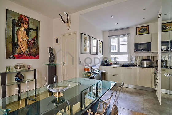 A fim de partilhar suas refeições no ambiente de convivialidade durante sua estância em Paris, este apartamento dispõe de uma sala de jantar graças a mesa de jantar, roupeiro, guarda-roupa, armário, loiça, 1 cadeira(s), entry way table, mirror, painting.
