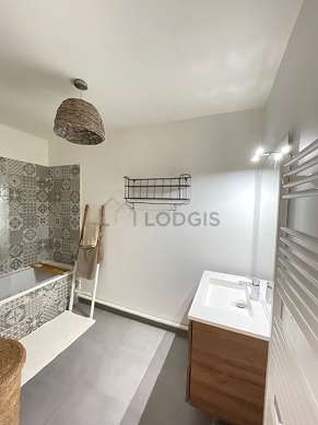 Este apartamento é equipado de uma casa de banho. Esta sala de água dispõe do necessário pelo seu bem estar na sua vida quotidiana : toalhas de banho, banheira, sink, radiator secador de toalhas. Os WC são separados da casa de banho e situados em uma peça independente.