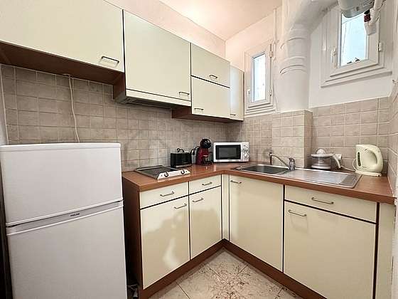 Este apartamento tem uma cozinha e todo o equipamento pela sua vida quotidiana : fogaõ, frigorífico, congelador, microondas, torradeira, chaleira, máquina de café.