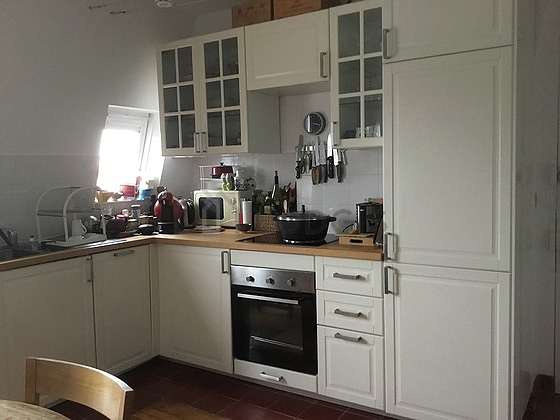 Este apartamento tem uma cozinha e todo o equipamento pela sua vida quotidiana : fogaõ, frigorífico, congelador, forno, microondas, torradeira, chaleira, máquina de café, armário, loiça.