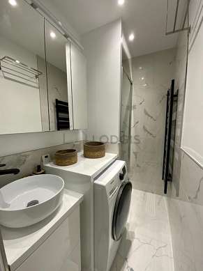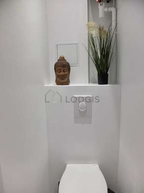 Este apartamento é equipado de uma casa de banho. Esta sala de água dispõe do necessário pelo seu bem estar na sua vida quotidiana : guarda-roupa, ducheiro separado, secador, airer, sink, mirror, radiator secador de toalhas. Os WC são separados da casa de banho e situados em uma peça independente.