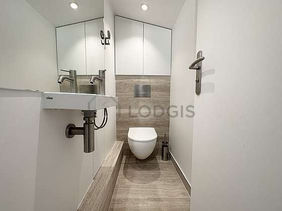 Este apartamento é equipado de uma casa de banho. Esta sala de água dispõe do necessário pelo seu bem estar na sua vida quotidiana : armário, ducheiro separado, sink. Os WC são separados da casa de banho e situados em uma peça independente.