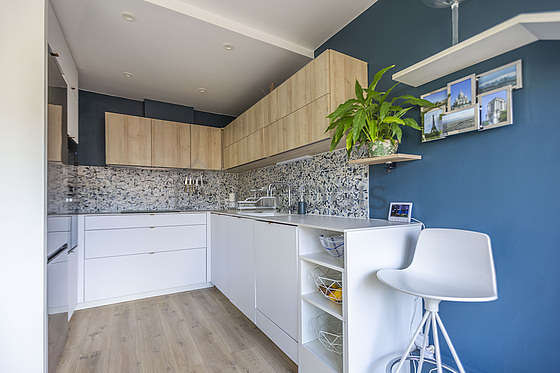 Este apartamento tem uma cozinha e todo o equipamento pela sua vida quotidiana : fogaõ, frigorífico, congelador, forno, microondas, exaustur, torradeira, chaleira, máquina de café, loiça.