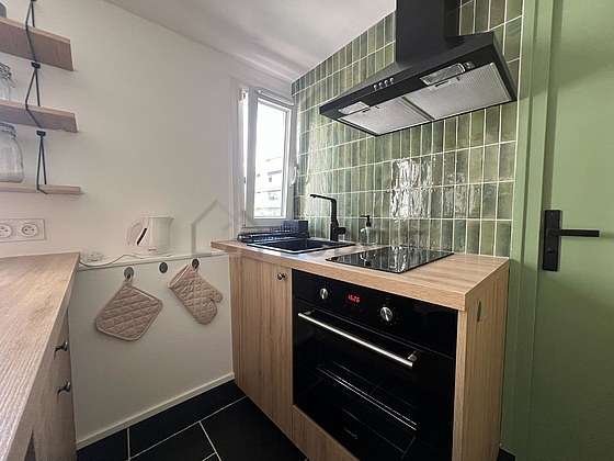 Este apartamento tem uma cozinha e todo o equipamento pela sua vida quotidiana : fogaõ, frigorífico, congelador, forno, máquina de café, mesa de jantar, prateleira, guarda-roupa, loiça, banco, bin, ventilator.