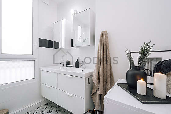Este apartamento é equipado de uma casa de banho. Esta sala de água dispõe do necessário pelo seu bem estar na sua vida quotidiana : toalhas de banho, ducheiro separado, secador, sink. Os WC são separados da casa de banho e situados em uma peça independente.