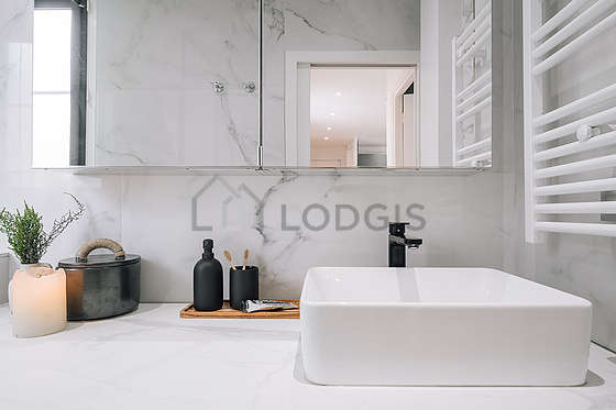 Este apartamento é equipado de uma casa de banho. Esta sala de água dispõe do necessário pelo seu bem estar na sua vida quotidiana : toalhas de banho, ducheiro separado, secador, sink. Os WC são separados da casa de banho e situados em uma peça independente.