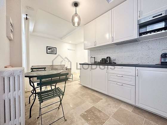 Este apartamento tem uma bonita cozinha com azuleijo no piso e todo o equipamento pela sua vida quotidiana : fogaõ, frigorífico, forno, micro-ondas combinado, freezer, exaustur, torradeira, chaleira, máquina de café, armário, loiça.