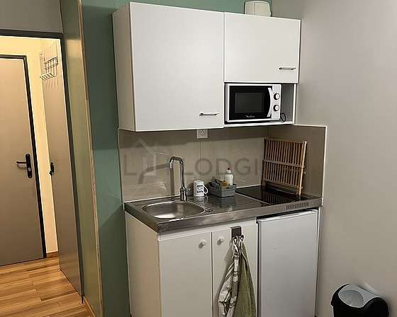 Este apartamento tem uma cozinha e todo o equipamento pela sua vida quotidiana : fogaõ, frigorífico, congelador, microondas, torradeira, mesa de jantar, guarda-roupa, loiça, towel rack, bin.