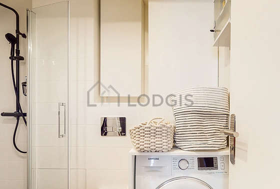 Este apartamento é equipado de uma casa de banho magnífico é muito clara. Esta sala de água dispõe do necessário pelo seu bem estar na sua vida quotidiana : toalhas de banho, armário, ducheiro separado, sink, towel rack, radiator secador de toalhas. Os WC são integrados na casa de banho.