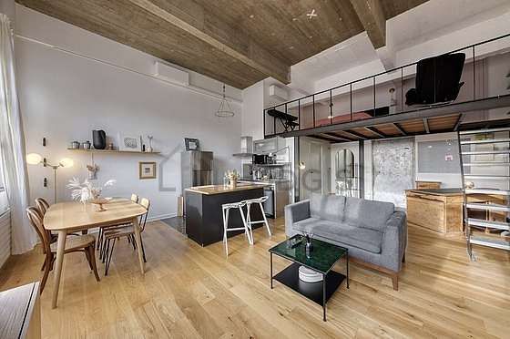 Este apartamento tem uma magnífico cozinha com parqué no piso e todo o equipamento pela sua vida quotidiana : fogaõ, frigorífico, congelador, forno, microondas, exaustur, torradeira, máquina de café, mesa de jantar, prateleira, armário, loiça, 1 cadeira(s).