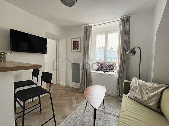 SalaõEste apartamento é composto de um salão com parqué no piso é janelas vitros duplos. Este salão mobiliado et equipado para uma agradável estância : televisaõ, sofá, mesinha.