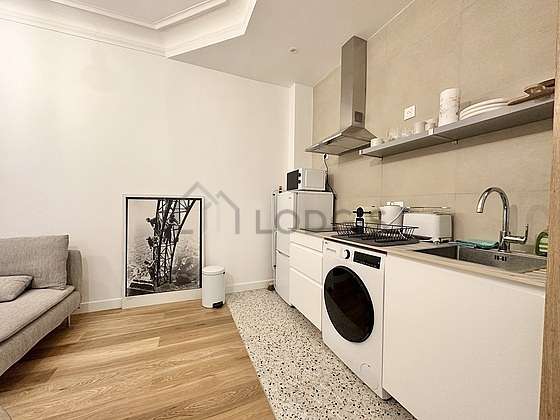 Este apartamento tem uma bonita cozinha com azuleijo no piso e todo o equipamento pela sua vida quotidiana : fogaõ, frigorífico, congelador, micro-ondas combinado, exaustur, torradeira, chaleira, máquina de café, armário, loiça.