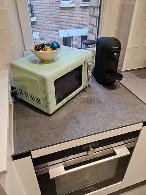 Este apartamento tem uma magnífico cozinha com azuleijo no piso e todo o equipamento pela sua vida quotidiana : fogaõ, frigorífico, congelador, forno, microondas, torradeira, chaleira, máquina de café, armário, loiça.
