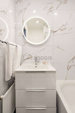 Este apartamento é equipado de uma casa de banho magnífico é muito clara. Esta sala de água dispõe do necessário pelo seu bem estar na sua vida quotidiana : toalhas de banho, banheira, secador, sink, towel rack, bin. Os WC são separados da casa de banho e situados em uma peça independente.