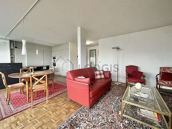 Este apartamento é composto de um agradável salão com parqué no piso é janelas. Este salão calmo mobiliado et equipado para uma agradável estância : televisaõ, aspirador, sofá, mesa de jantar, mesinha, armário, 1 cadeira(s), tv stand.