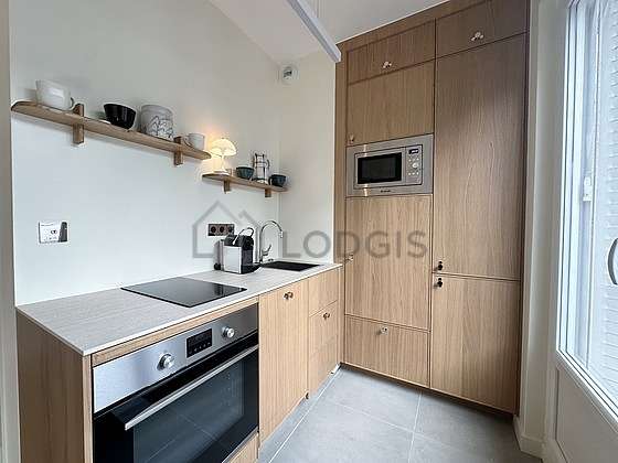 Este apartamento tem uma cozinha com azuleijo no piso e todo o equipamento pela sua vida quotidiana : fogaõ, frigorífico, congelador, forno, microondas, freezer, máquina de café.