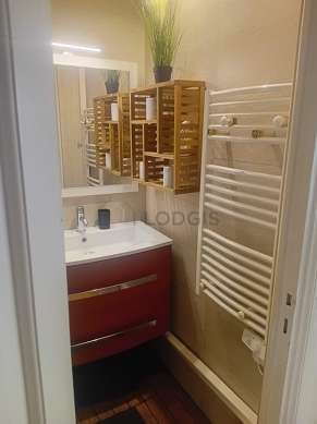 Este apartamento é equipado de uma casa de banho. Esta sala de água dispõe do necessário pelo seu bem estar na sua vida quotidiana : armário, ducheiro separado, radiator secador de toalhas. Os WC são separados da casa de banho e situados em uma peça independente.