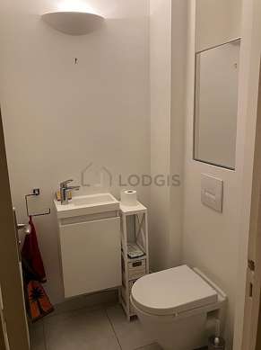 Este apartamento é equipado de uma casa de banho. Esta sala de água dispõe do necessário pelo seu bem estar na sua vida quotidiana : banheira, ducheiro separado, secador, sink, mirror, towel rack, bin, ventilator. Os WC são separados da casa de banho e situados em uma peça independente.