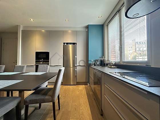 Este apartamento tem uma magnífico cozinha com parqué no piso e todo o equipamento pela sua vida quotidiana : fogaõ, frigorífico, congelador, forno, microondas, exaustur, ferro, aspirador, torradeira, chaleira, máquina de café, mesa de jantar, armário, loiça, 8 cadeira(s), sink, work surface, bin.