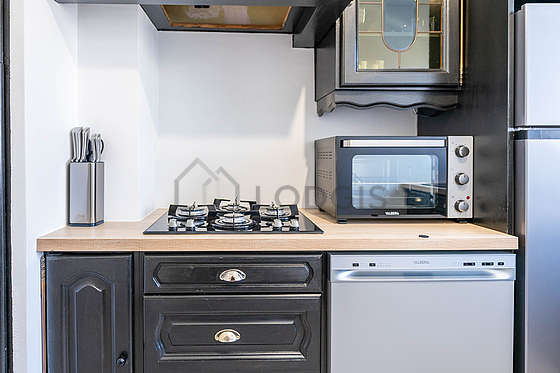 Este apartamento tem uma cozinha com azuleijo no piso e todo o equipamento pela sua vida quotidiana : frigorífico, microondas, freezer, máquina de café.
