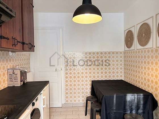 Este apartamento tem uma cozinha e todo o equipamento pela sua vida quotidiana : televisaõ, fogaõ, frigorífico, microondas, exaustur, torradeira, chaleira, máquina de café, mesa de jantar, prateleira, banco, work surface.