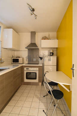 Este apartamento tem uma bonita cozinha com azuleijo no piso e todo o equipamento pela sua vida quotidiana : fogaõ, frigorífico, congelador, forno, microondas, exaustur, torradeira, chaleira, máquina de café, mesa de jantar, armário, loiça, banco.