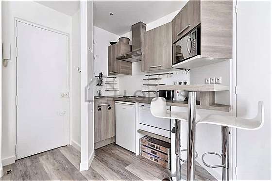 Este apartamento tem uma bonita cozinha com parqué no piso e todo o equipamento pela sua vida quotidiana : fogaõ, frigorífico, microondas, freezer, exaustur, torradeira, chaleira, máquina de café, armário, loiça, banco, bar.