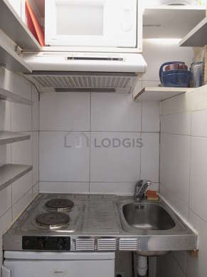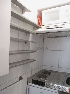 Este apartamento tem uma cozinha com azuleijo no piso e todo o equipamento pela sua vida quotidiana : fogaõ, frigorífico, microondas, freezer, torradeira, chaleira, máquina de café, armário, loiça.