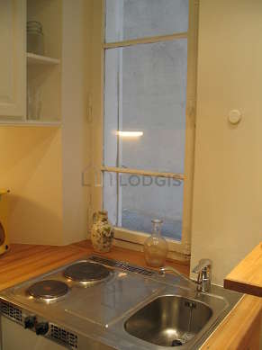 Este apartamento tem uma bonita cozinha com azuleijo no piso e todo o equipamento pela sua vida quotidiana : fogaõ, frigorífico, forno, microondas, freezer, torradeira, chaleira, máquina de café, armário, loiça, 2 cadeira(s), bar.