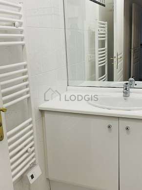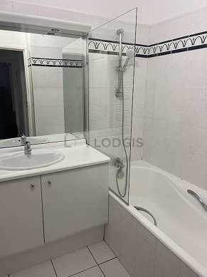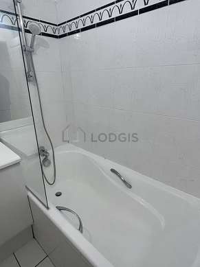 Este apartamento é equipado de uma casa de banho agradável. Esta sala de água dispõe do necessário pelo seu bem estar na sua vida quotidiana : toalhas de banho, armário, banheira, radiator secador de toalhas. Os WC são separados da casa de banho e situados em uma peça independente.