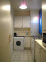 Este apartamento tem uma cozinha com azuleijo no piso e todo o equipamento pela sua vida quotidiana : fogaõ, frigorífico, micro-ondas combinado, freezer, torradeira, máquina de café, prateleira, armário, loiça.
