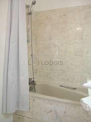 Este apartamento é equipado de uma casa de banho magnífico. Esta sala de água dispõe do necessário pelo seu bem estar na sua vida quotidiana : toalhas de banho, prateleira, armário, banheira, secador, radiator secador de toalhas. Os WC são separados da casa de banho e situados em uma peça independente.