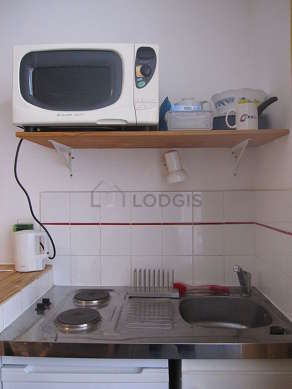 Este apartamento tem uma cozinha com azuleijo no piso e todo o equipamento pela sua vida quotidiana : fogaõ, frigorífico, microondas, freezer, torradeira, chaleira, máquina de café, prateleira, armário, loiça.