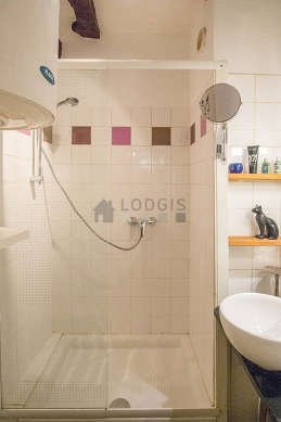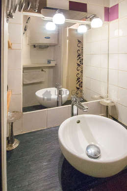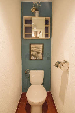 Este apartamento é equipado de uma casa de banho agradável. Esta sala de água dispõe do necessário pelo seu bem estar na sua vida quotidiana : toalhas de banho, prateleira, ducheiro separado, secador, sink. Os WC são separados da casa de banho e situados em uma peça independente.