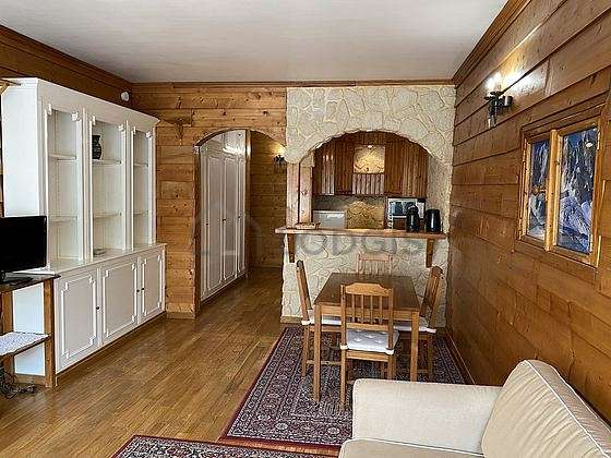 Este apartamento é composto de um atraente salão com parqué no piso é janelas com balcão é vista sobre rua. Este salão mobiliado et equipado para uma agradável estância : televisaõ, sofá, 2 poltrona(s), mesa de jantar, mesinha, roupeiro, prateleira, armário, 4 cadeira(s)1 sofá-cama.