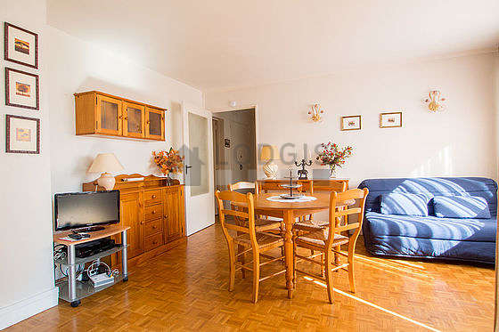 Este apartamento é composto de um agradável salão com parqué no piso é janelas é vista sobre jardim. Este salão very quiet mobiliado et equipado para uma agradável estância : televisaõ, lençois, sofá, mesa de jantar, mesinha, comoda, 6 cadeira(s)1 sofá-cama.