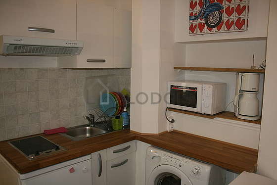 Este apartamento tem uma cozinha com parqué no piso e todo o equipamento pela sua vida quotidiana : fogaõ, frigorífico, freezer, torradeira, chaleira, prateleira, armário, loiça.