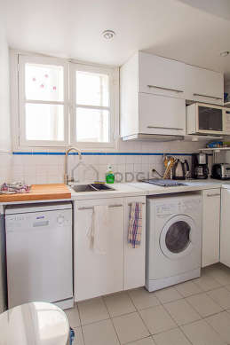 Este apartamento tem uma bonita cozinha com azuleijo no piso e todo o equipamento pela sua vida quotidiana : fogaõ, frigorífico, forno, microondas, freezer, exaustur, torradeira, chaleira, máquina de café, loiça.