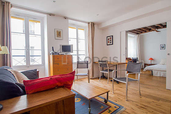 Este apartamento é composto de um atraente salão com parqué no piso é janelas é vista sobre rua. Este salão calmo mobiliado et equipado para uma agradável estância : televisaõ, lençois, colchas, mesa de jantar, mesinha, prateleira, comoda, 6 cadeira(s)1 sofá-cama.